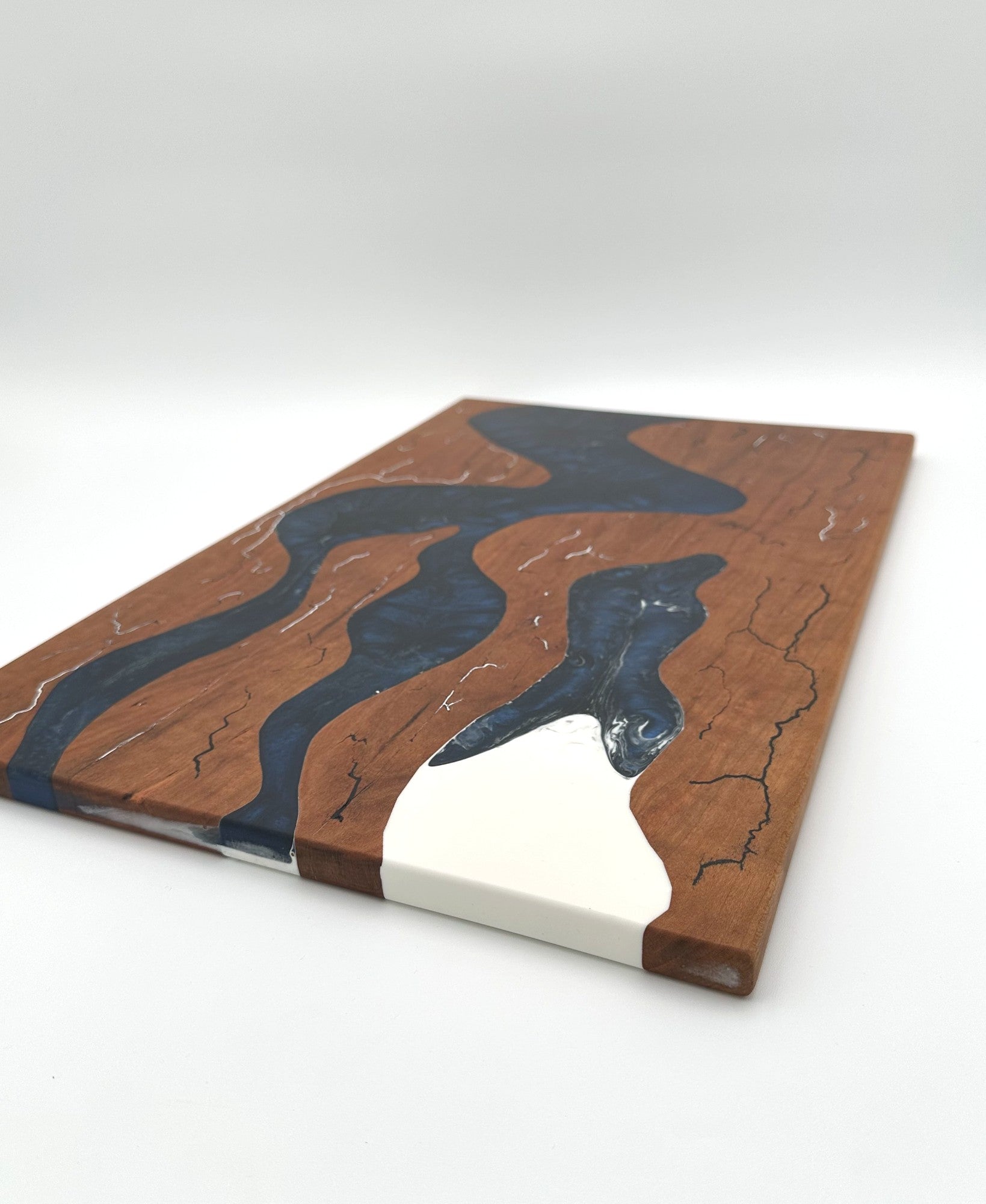 Rustic Cherry Wood Charcuterie Board Handmade with blue & white resin fractal inlay