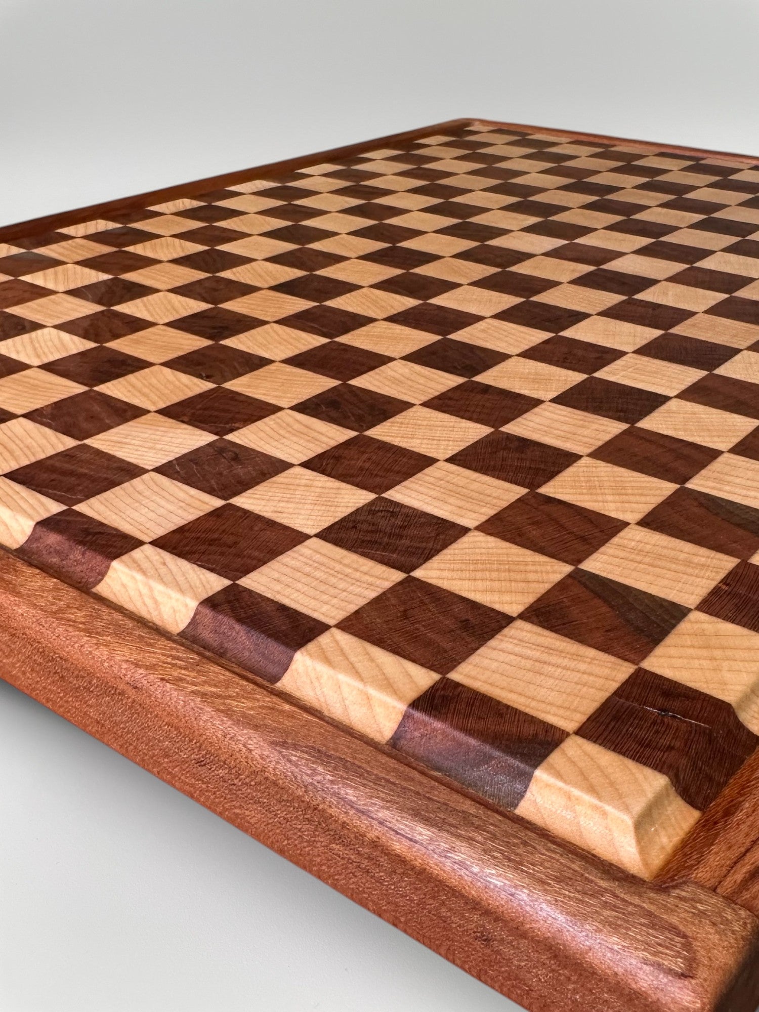 This 16x12.5 inch cutting board is crafted for both beauty and durability. Made from Walnut and Maple wood in end grain, its 1.5-inch thickness offers a sturdy, elegant surface for everyday use.