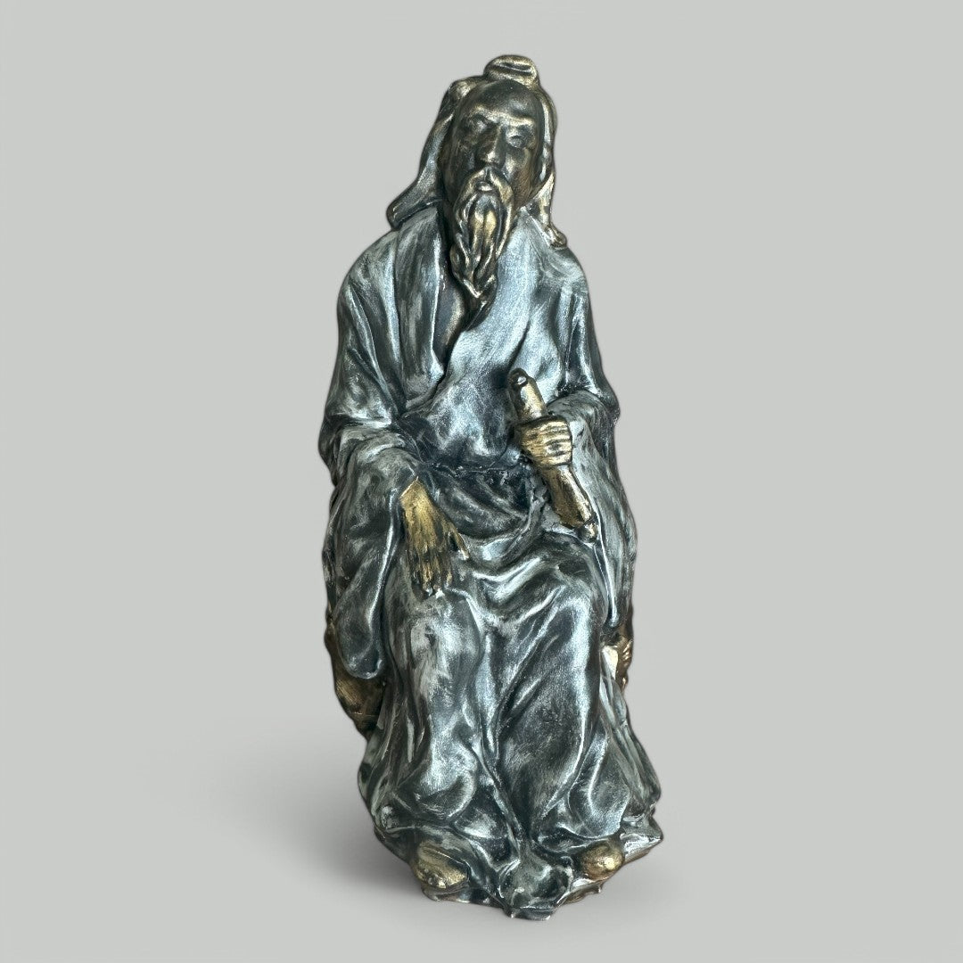 Embrace the spirit of wisdom and contemplation with this intricately crafted resin statue of a revered sage. Standing 170mm tall and weighing 3.8lbs (1.75kg), this finely detailed piece is hand-finished in pewter and bronze coloring, giving it the look of aged metal while preserving the precision of its sculpted features.