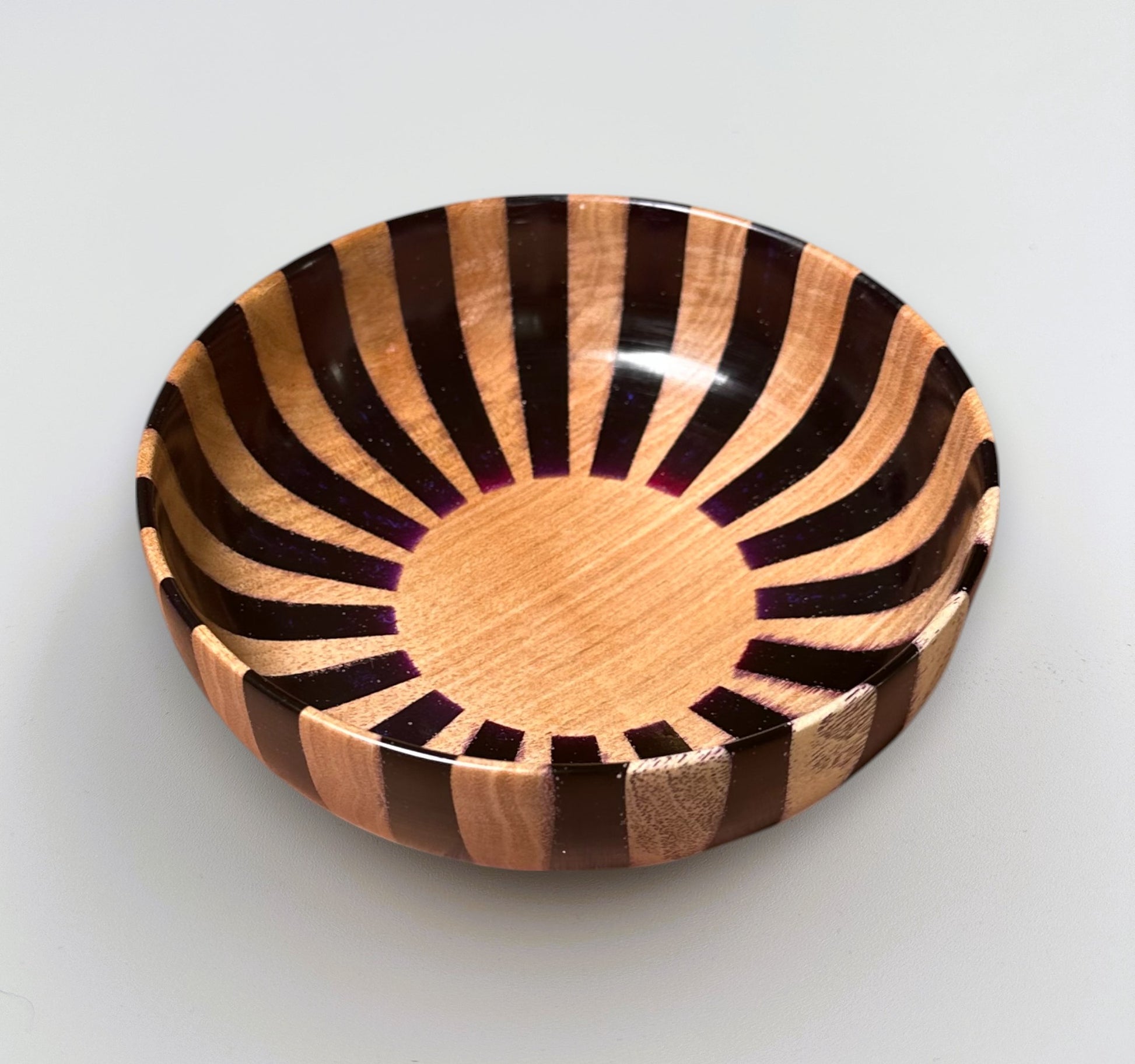 This handcrafted 5.2-inch snack bowl, made from Maple wood, presents a unique touch with its red and white geo pattern inlay. At 1.5 inches deep, it’s perfect for serving snacks with a side of style.